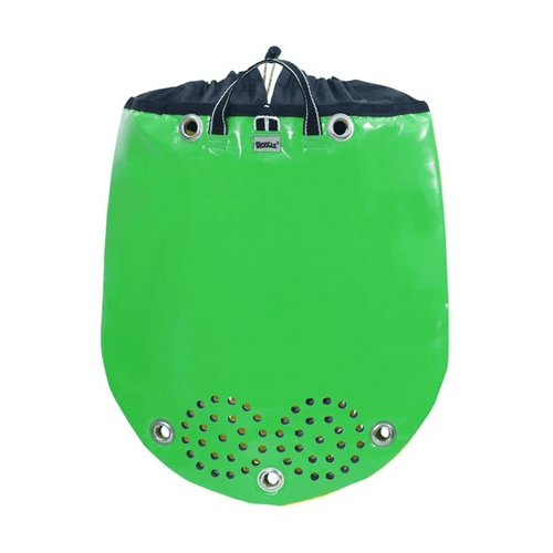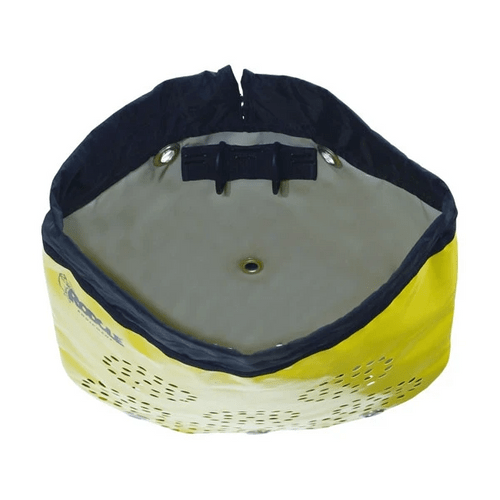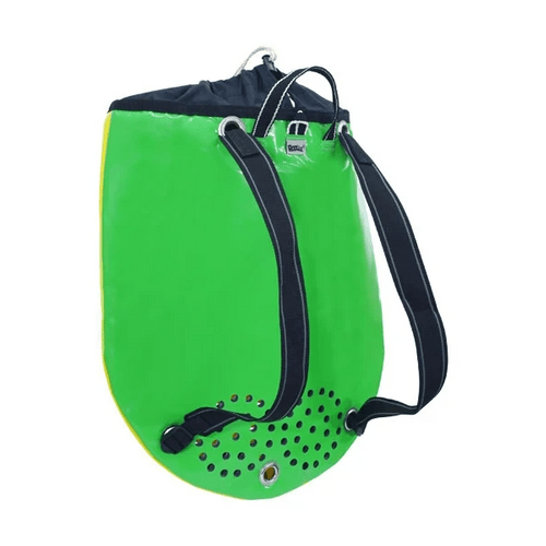 Emergency bag (“kit boule”) for canyoning. Water evacuation via a large grille along the front of the bag.